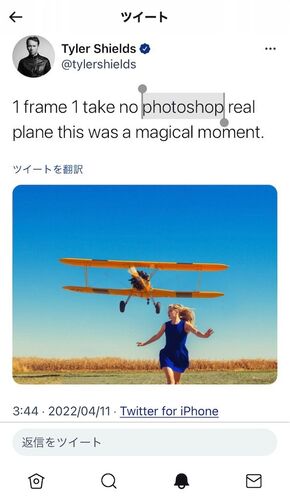 "Photoshop" が、Adobe製の写真加工するアプリと知らねば、英語ツィートの意味すらとれない(Google翻訳はまだ品質追いつかない)。 このshutter chance。切り取られた瞬間が写真家 タイラー・シールズ氏 の『一瞬』。 それをTwitterからスマホのスクショで…