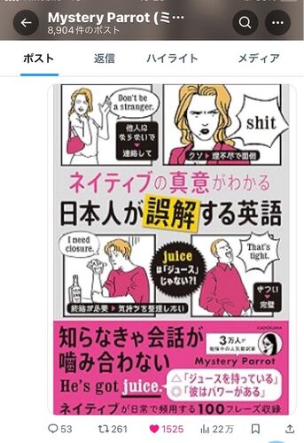 それは、やりましたねー!スゴイすごい。おめでとう㊗️ございます。ますますのご活躍を。とレスしておいたのが、こちら 出版ご成功、おめでとう㊗️ございます。( 出所 : Mystery_Parrot さんご本人のポスト ) 『ネイティブの真意がわかる日本人が誤解する英…