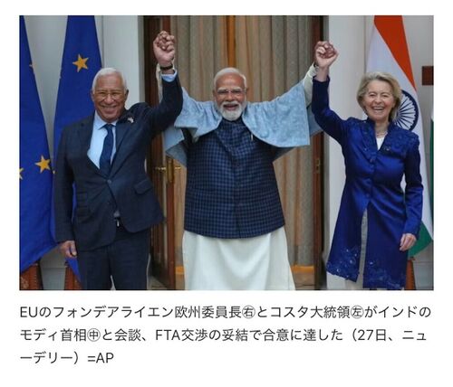 EUとインドがFTA妥結 人口規模20億人、広がる「米抜き貿易圏」 南西ア・オセアニア2026年1月27日 16:08(2026年1月27日 19:23更新)[会員限定記事] 【ブリュッセル=辻隆史、ベンガルール=岩城聡】欧州連合(EU)とインドは27日、自由貿易協定(FTA)交渉で妥結…